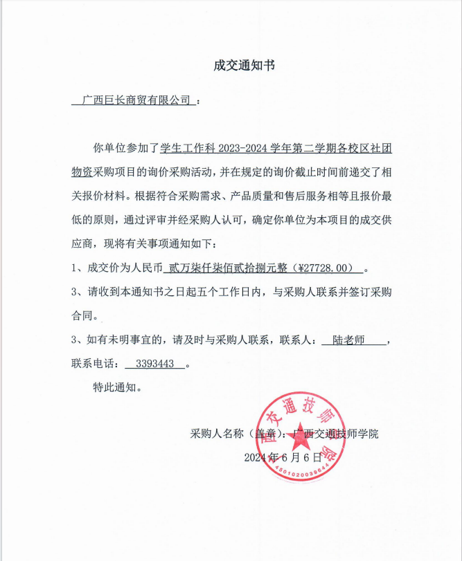 | 关于学生工作科2023-2024学年第二学期各校区社团物资采购项目成交结果公告 |