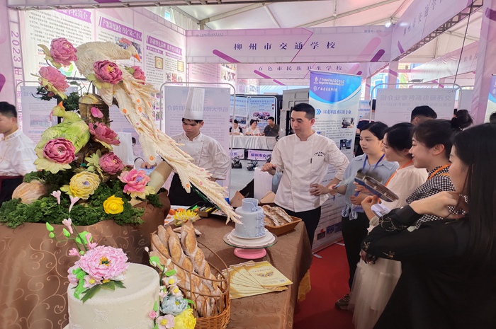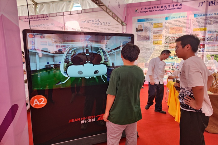 在此次活动周中,学院紧扣“技能:让生活更美好”的主题,重点展示学院近年来在教师队伍建设、课程建设、教学改革、实践教学、科研能力、校企合作等方面取得的成绩。民用航空系通过展板、实物、演示等形式展示了民用航空知识、飞机的机型和特点、飞机结构及维修等;信息工程系深度对接企业,充分展示口腔义齿制造专业3D扫描牙齿、雕牙技能和3D打印技术;商务服务系参展师生利用心里美萝卜、青萝卜、胡萝卜等普通食材,连夜完成具有壮乡风情的主雕刻作品—孔雀迎宾,展示了良好的刀工、雕刻技艺。