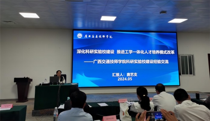 学院教务科研科科长唐艺支在会上作《深化科研实验校建设 推进工学一体化人才培养模式改革》发言,分享学院获首批“广西技工教育科研实验校”的创建经验。