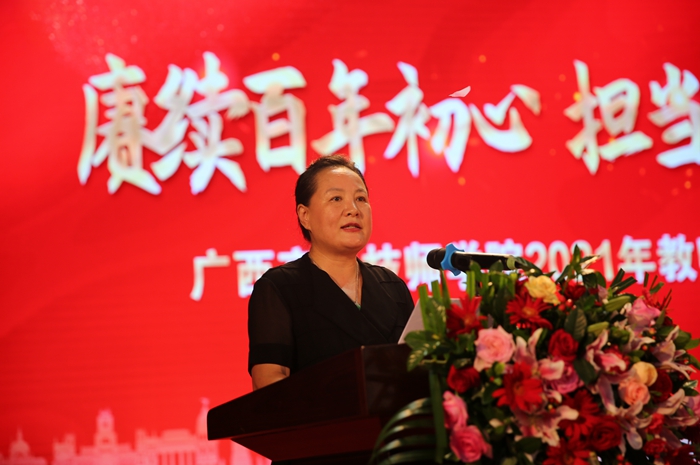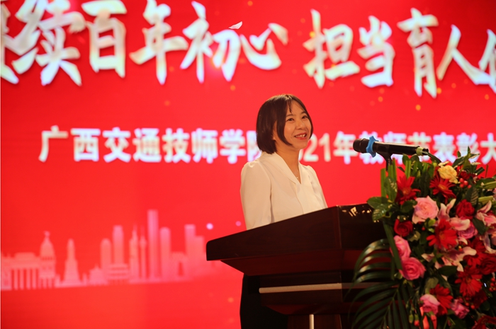 第七届广西技工院校专业(学科)带头人、自治区级技能大师罗宗港老师和全国技工院校教师职业能力大赛广西选拔赛一等奖获得者覃春丽老师分别上台发言,纷纷感谢学院为教师成长搭建大平台,使他们能够充分施展才华和本领,表示将铭记自治区交通运输厅、学院领导的殷切期望,不忘教师立德树人之初心,牢记教书育人之使命,承载起学院领导和学生家长的嘱托与希望,履职尽责,引导关爱学生,传道授业解惑,为培养交通运输行业高技能人才而不懈努力。2021年新入职的教师代表李思颖老师表示,将在今后的教学生涯中,多向优秀教师和优秀教育工作者们学习,将个人发展与学院发展结合起来,充分利用好各项政策和平台,奋发有为、奋勇前行,为学院高质量发展贡献自己的力量。