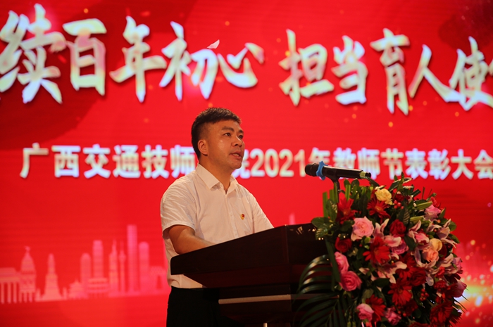 自治区交通运输厅党组成员欧阳斌代表自治区交通运输厅党组作讲话,向辛勤工作在教育战线上的全体教职工表示节日的祝福和亲切的问候。对获得表彰的优秀教师、优秀教育工作者、防汛先进个人表示热烈的祝贺!并提出殷切希望:一是希望学院继续保持俯首甘为孺子牛的干劲,办好技工教育,把握好当前的发展机遇,推动学校的办学更上一个层次,在广西交通高速发展的征途上添一把助力;二是希望学院抓住机遇,与时俱进,积极对接广西现代综合交通运输体系建设的“铁、公、水、空”全领域人才需求,大力发展具有行业特色的职业教育;三是希望学院赓续百年初心,担当育人使命,以立德树人为宗旨,弘扬红色优良传统,勇于创新,推进教育教学改革,进一步焕发生机和活力,为建设广西交通强区作出积极贡献。