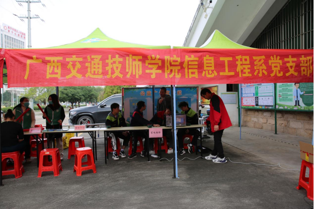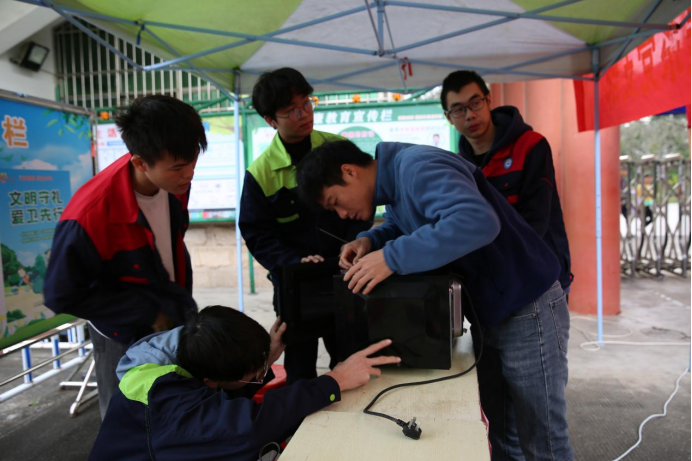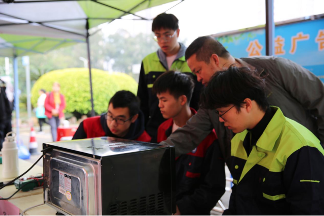 3月12日上午,信息工程系龙善强老师带领机电维修小组4名学生在狮山公园西门,开展同升线路检测中心信息工程系党支部主题党日活动,为周边居民义务维修家电。
