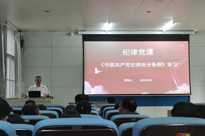 为深入贯彻学习新修订的《中国共产党纪律处分条例》,进一步教育引导党员切实做到“学纪、知纪、明纪、守纪”,5月29日下午,信息工程系党支部在求学楼阶梯教室开展《中国共产党纪律处分条例》学习教育专题党课,学院纪委书记蒙青山主讲,信息工程系党支部书记罗莎主持。