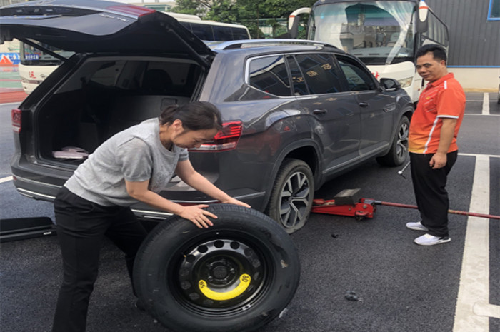 方世仁、侯林倩同志在更换车辆备胎