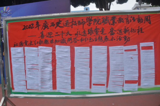 为深入落实习近平总书记关于青年工作的重要思想,在青少年中广泛宣传党的十八大以来党和国家事业取得的历史性成就、发生的历史性变革,营造我院职业教育活动周的良好氛围,展示学生社团风采,5月21日,我院学生工作科组织学院各学生社团开展“喜迎二十大 永远跟党走 奋进新征程”社团党史红歌趣味知识问答和红色主题社团展示活动。